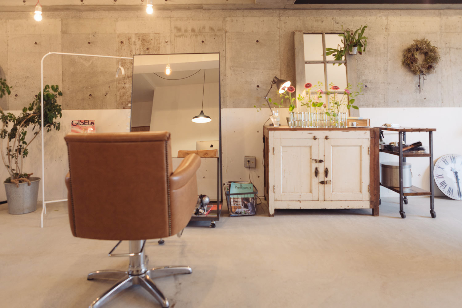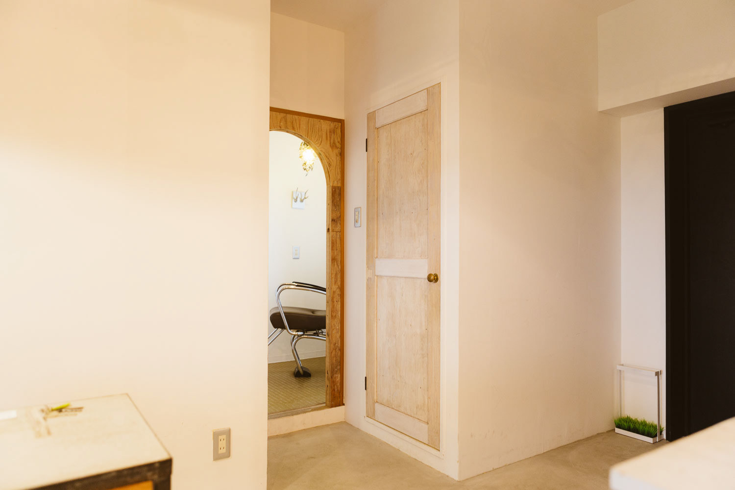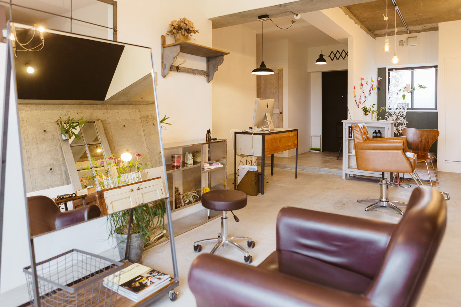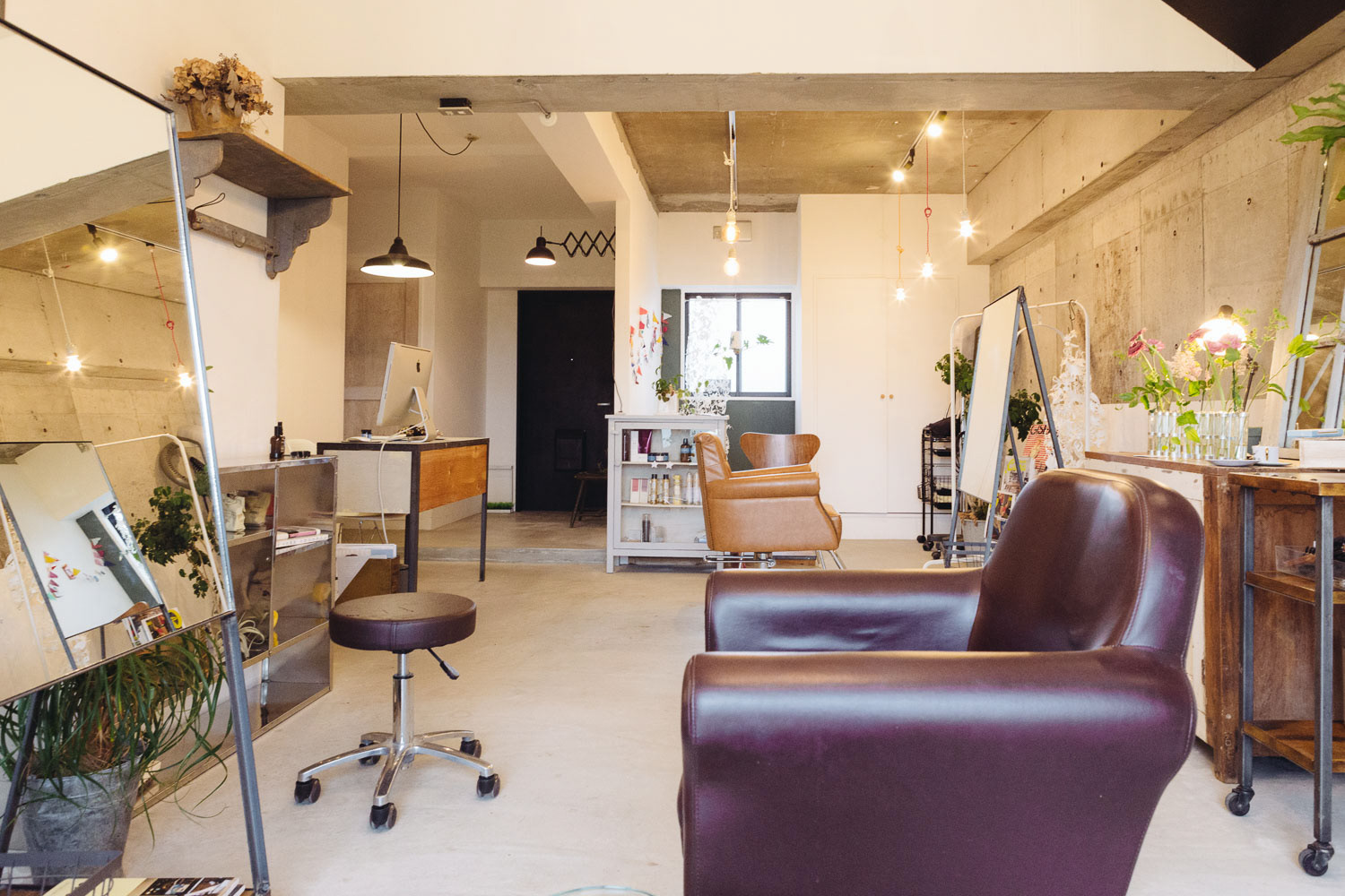 小さいころ、せっせと作った場所、アジト。そんな秘密っぽい、そして楽しいそうな美容室です。マンションの一室を改装して作られたこの場所は知り合いやその友達の方たちのアジトのように営業しています。 改装時、天井を抜いた時に、梁にかかる白壁が終わる部分がかっこよかったので、そのまま残したり、スイッチがちょっと不思議な場所についていたりと、作る側も楽しみながら作りました。 各椅子の前にあるアイアン製のガラス、テーブルはsnldオリジナル。可愛げある室内にアイアンのかっこよさを加えました。
