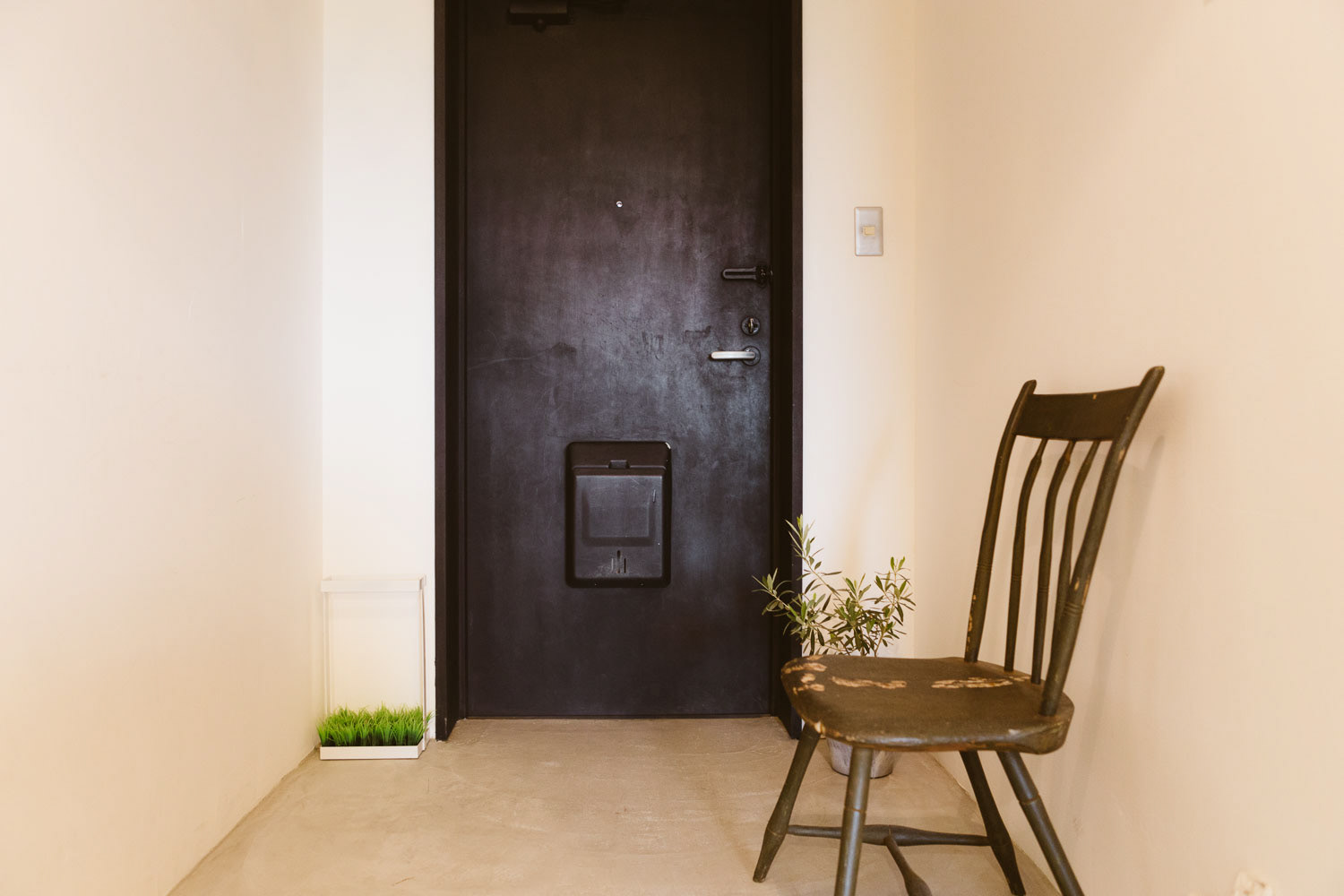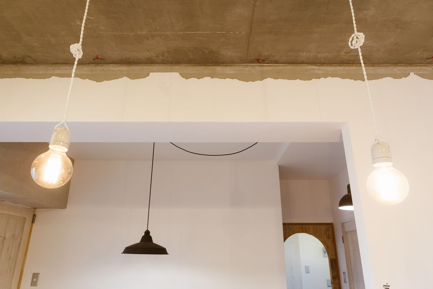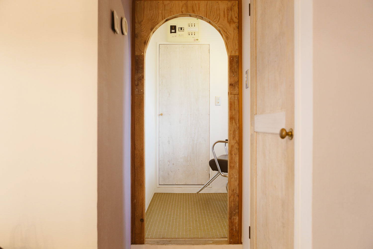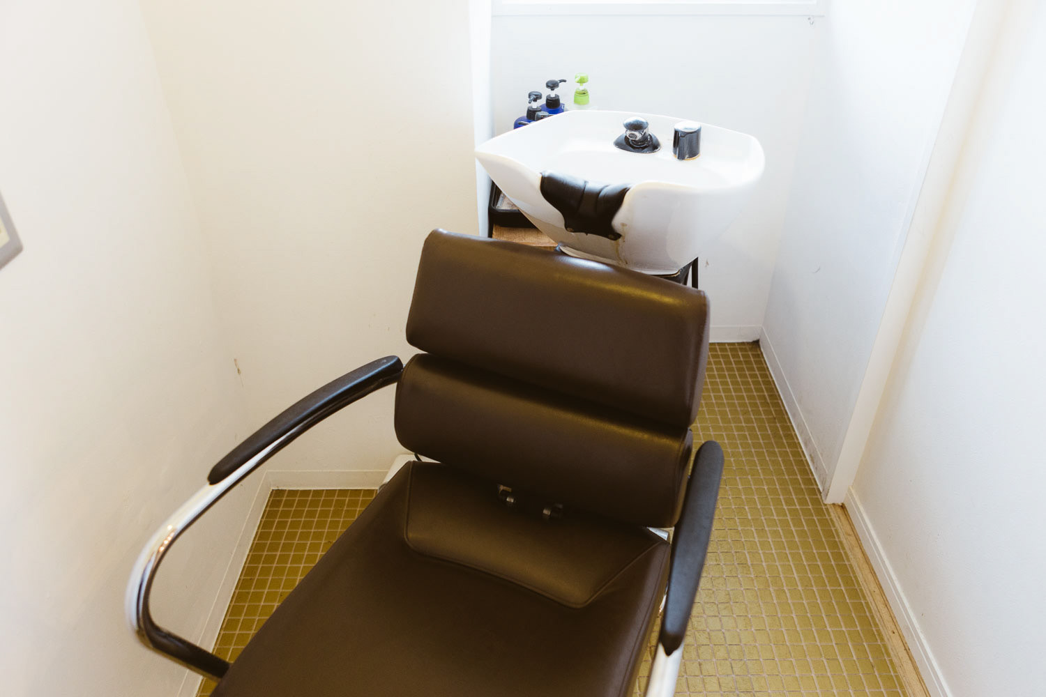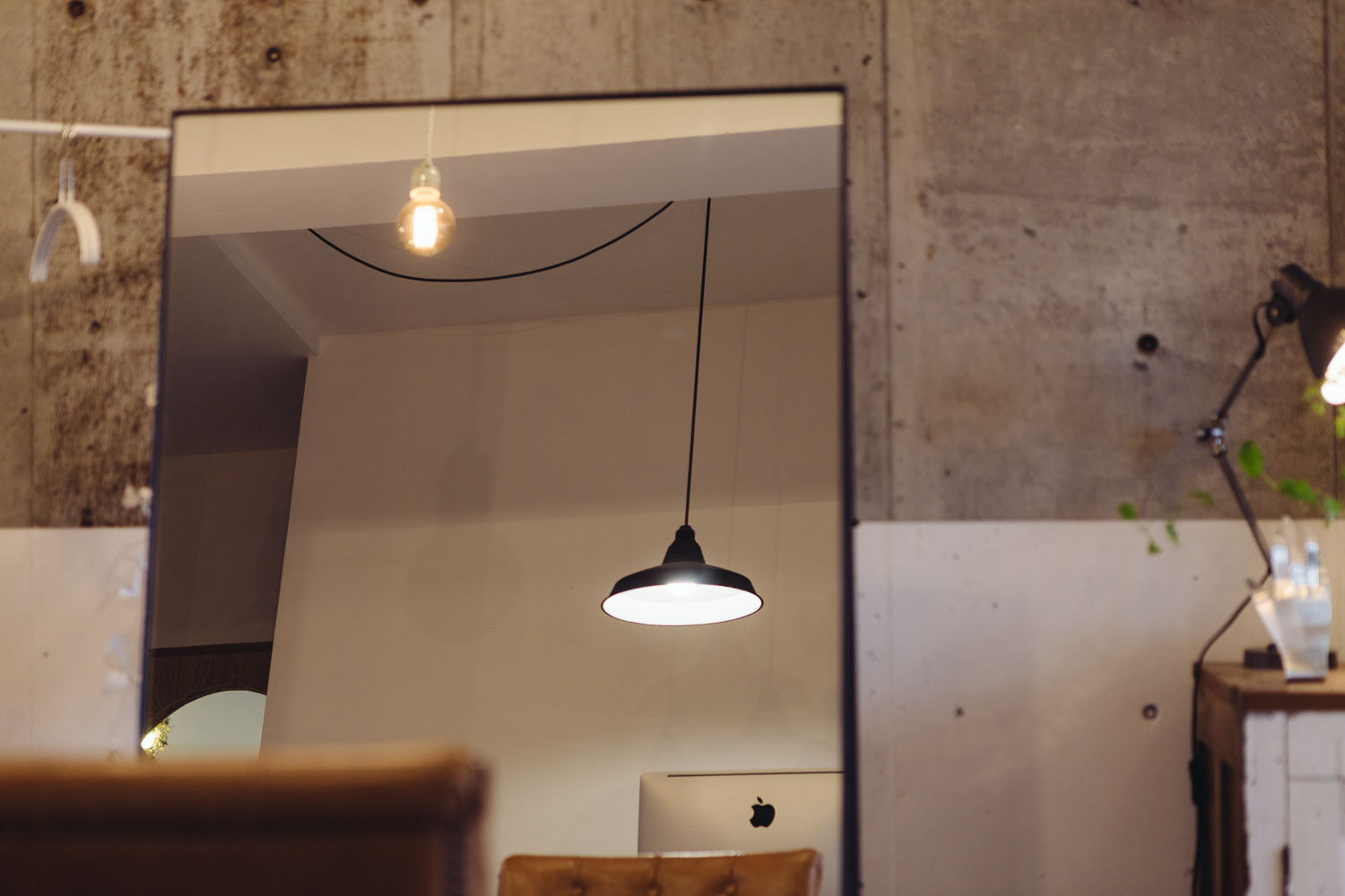 小さいころ、せっせと作った場所、アジト。そんな秘密っぽい、そして楽しいそうな美容室です。マンションの一室を改装して作られたこの場所は知り合いやその友達の方たちのアジトのように営業しています。 改装時、天井を抜いた時に、梁にかかる白壁が終わる部分がかっこよかったので、そのまま残したり、スイッチがちょっと不思議な場所についていたりと、作る側も楽しみながら作りました。 各椅子の前にあるアイアン製のガラス、テーブルはsnldオリジナル。可愛げある室内にアイアンのかっこよさを加えました。